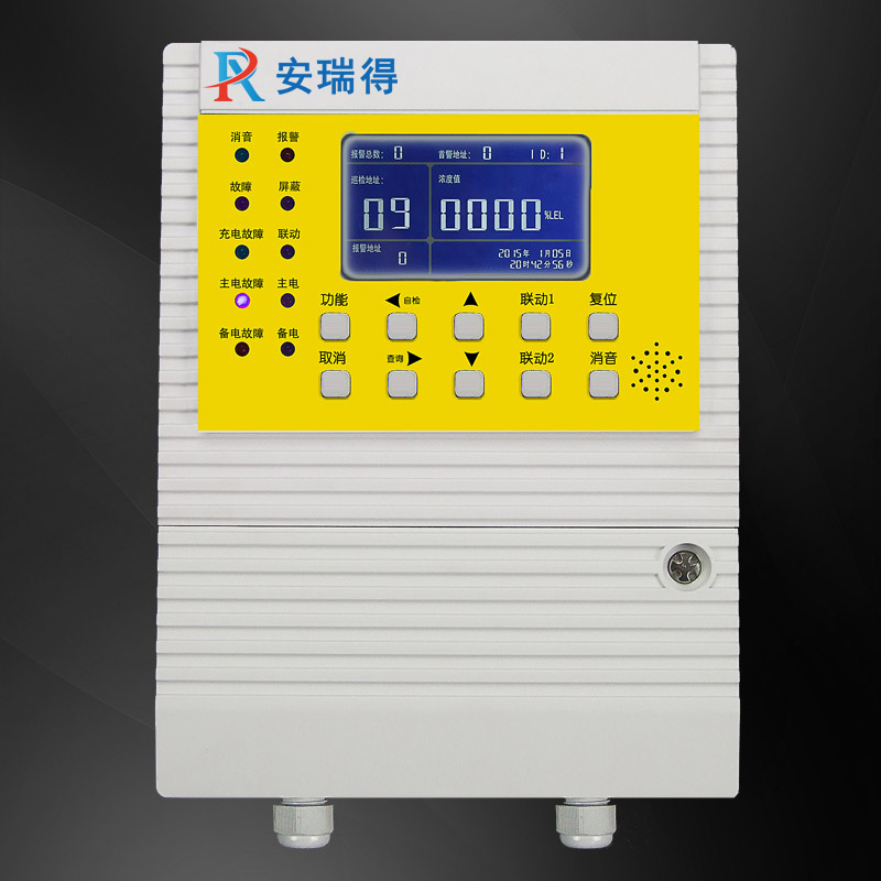 ARD-K6000-ZL型可燃有毒氣體控制器通過查詢方式獲得探測器信息,經(jīng)過高速CPU數(shù)據(jù)處理,通過LCD顯示出探測器相應的濃度、狀態(tài)并輸出相應的控制信號。