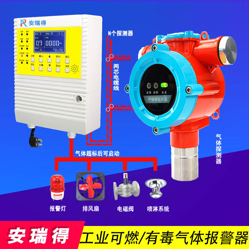產(chǎn)品描述:可燃氨氣氣體報(bào)警器可以有效的檢測(cè)出可燃有毒性氣體的濃度,預(yù)防氣體泄漏后可燃有毒性氣體濃度超標(biāo)??扇及睔鈿怏w報(bào)警器是由氣體報(bào)警控制器和氣體探測(cè)器兩部分組成,控制器可放置于值班室內(nèi),主要對(duì)各監(jiān)測(cè)點(diǎn)進(jìn)行控制,可燃有毒性氣體探測(cè)器安裝于氣體zui易泄漏的地點(diǎn),氣體探測(cè)器的核心部件為內(nèi)置的氣體傳感器,可燃?xì)怏w傳感器檢測(cè)空氣中可燃?xì)怏w的濃度。氣體探測(cè)器將傳感器檢測(cè)到的可燃?xì)怏w濃度轉(zhuǎn)換成電信號(hào),通過(guò)線纜傳輸?shù)娇刂破鳎扇加卸拘詺怏w濃度越高,電信號(hào)越強(qiáng),當(dāng)氣體濃度達(dá)到或超過(guò)氣體報(bào)警控制器設(shè)置的報(bào)警點(diǎn)時(shí),氣體報(bào)警控制器發(fā)出報(bào)警信號(hào),并可啟動(dòng)電磁閥、排氣扇等外聯(lián)設(shè)備,自動(dòng)排除隱患。